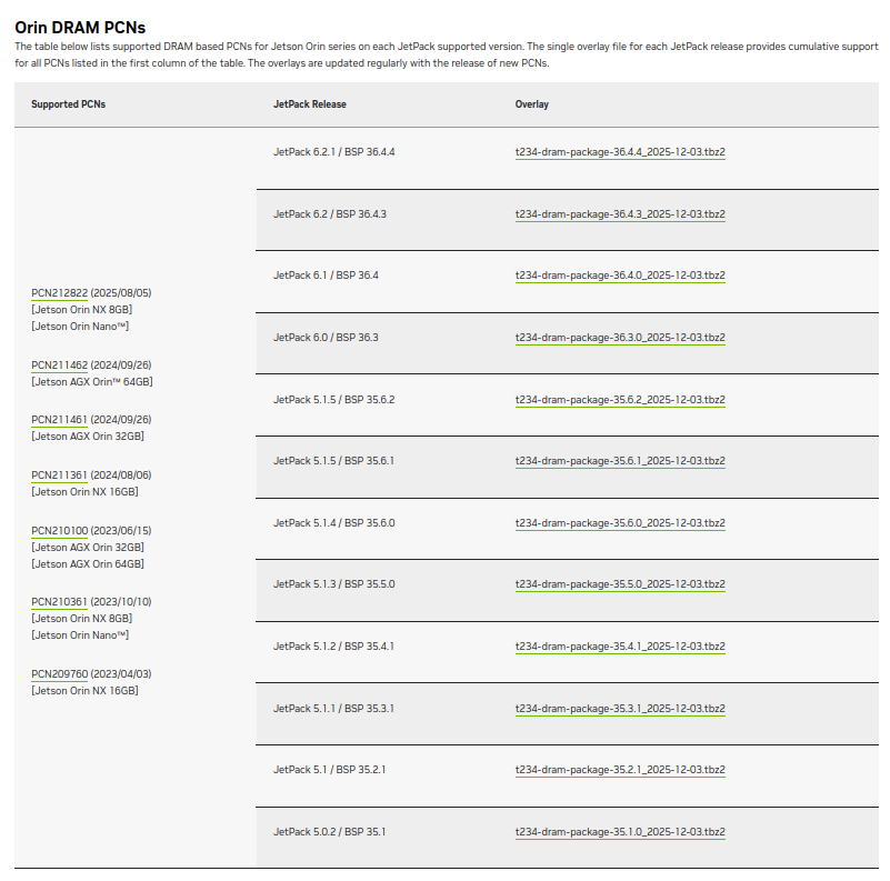 For example, this are the available PCN's to the date for the Orin module with their respective Jetpack version.