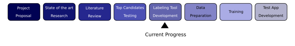 The following image shows the roadmap for the project. Currently, a Labeling Tool is being developed to match our tagging needs and also to generate a very general approach that can match any customer's needs to label videos or images for their AI project needs. Once the tool is finished a proof-of-concept demonstration will be generated to automatically show scoring in a Mixed Martial Arts match.