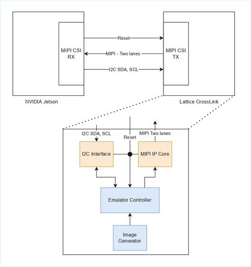 This project emulates the essential behavior of a Sony IMX219 image sensor using a Lattice CrossLink FPGA, allowing an NVIDIA Jetson platform to detect and use the emulator as if a real camera were connected.
