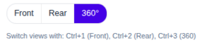 The camera selection section allows the operator to switch between the available camera views. The Web Interface provides three selectable views: Front, Rear, and 360°. Selecting a view sends a camera selection command to the robot, which updates the active video source used by the streaming service.